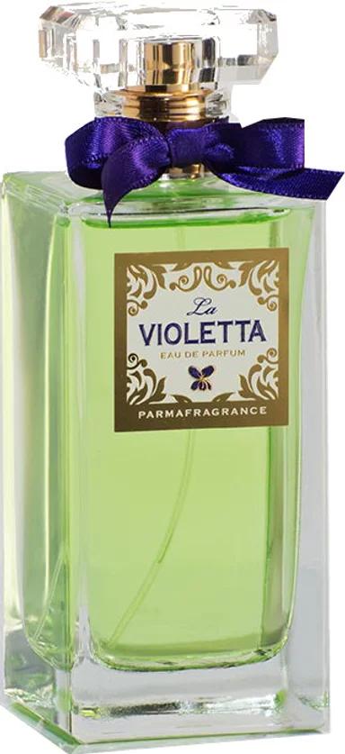 Eau de Parfum La Violetta. L’inconfondibile fragrance della Violetta di Parma con maggior intensità ma mai indiscreta. La freschezza verde delle foglie cede al cuore dolce del fiore.Come vuole la tradizione la fragranza è di colore verde